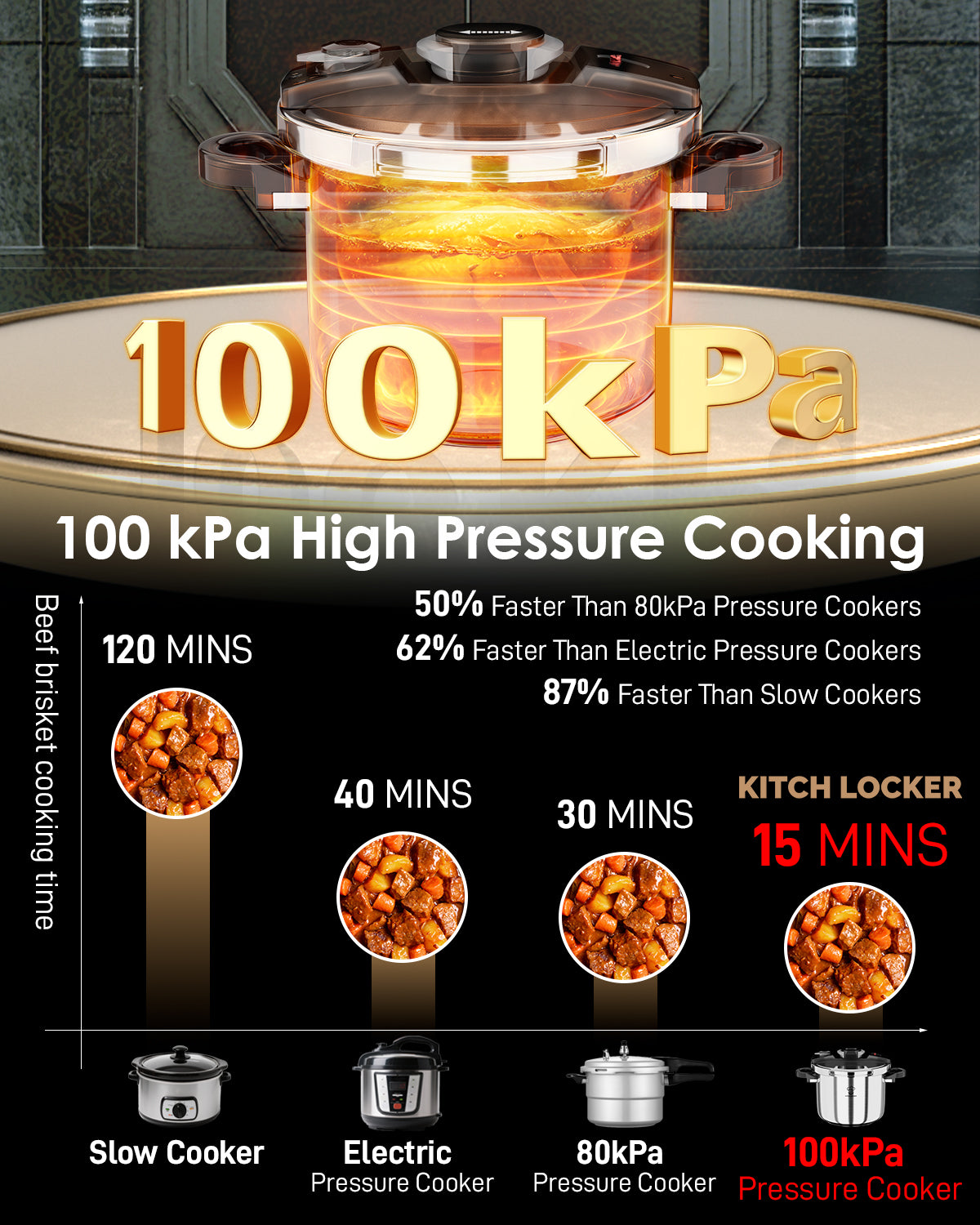 - Faster Cooking, Less Time — This stove top pressure cooker operates at 100kPa, cooking tougher ingredients like beef brisket in just 15 minutes. That's 50% faster than traditional pressure cookers, 62% quicker than electric pressure cookers, and an incredible 87% faster than slow cookers, helping you get meals on the table in a flash.