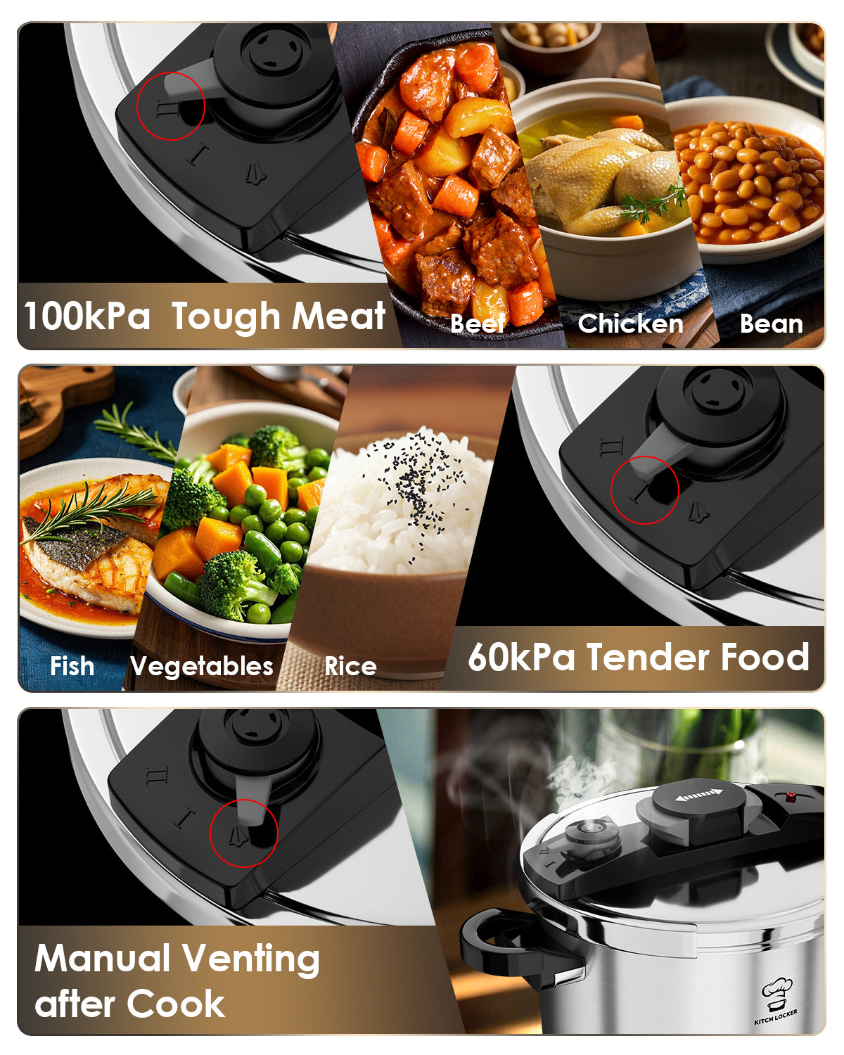 - Customizable Cooking Settings — The three adjustable pressure levels (100kPa, 60kPa, and venting mode) give you precise control. Use the high-pressure setting for tough foods like large meat cuts and beans, the medium setting for rice, vegetables, and fish, and the venting mode to release pressure quickly and save time.