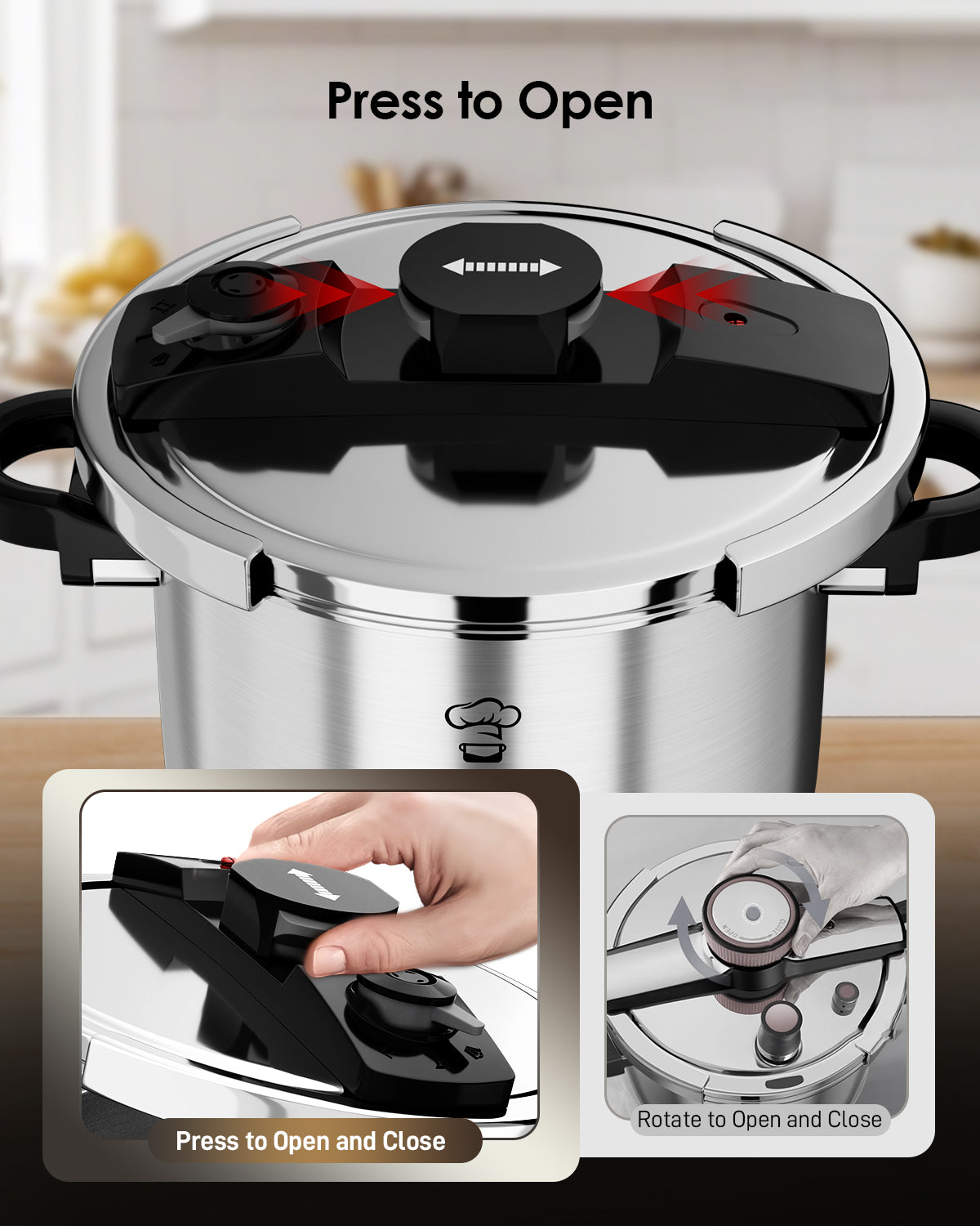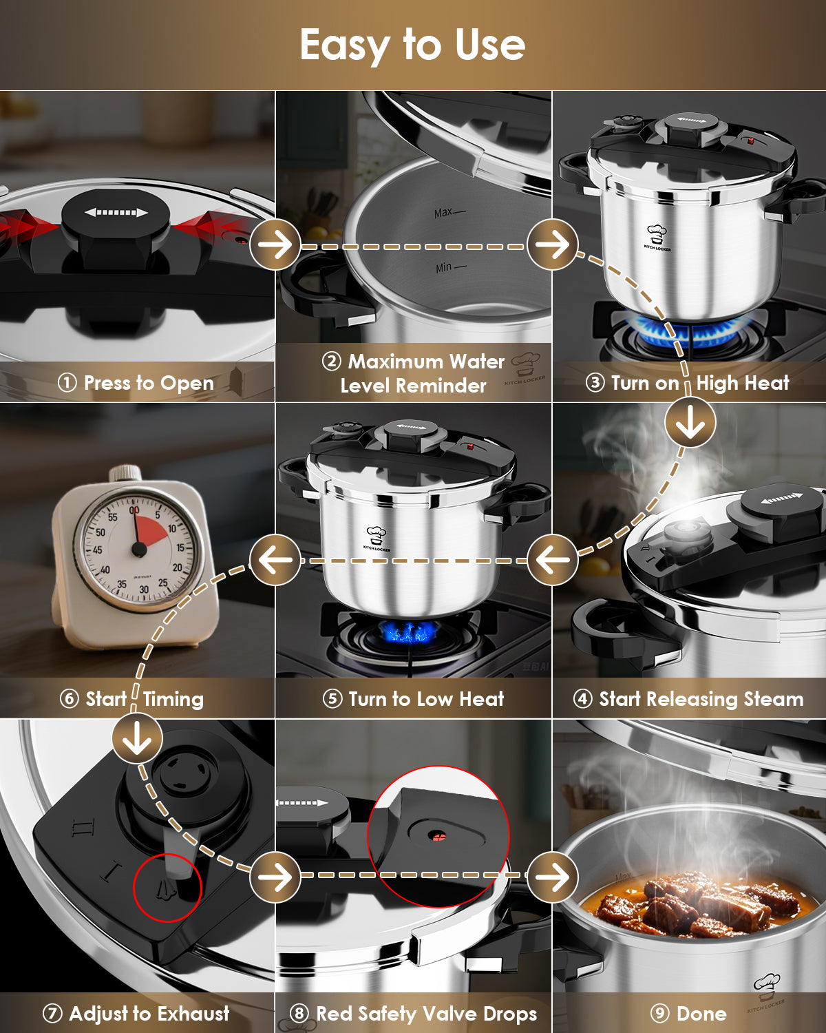 - Simple Cooking Steps —Just press to open, add water below the max line, select your pressure level, then turn on high heat. Once the steam starts flowing steadily, turn down the heat and start timing. When done, release pressure, wait for the safety valve to relax, and you’re ready to serve—easy peasy!